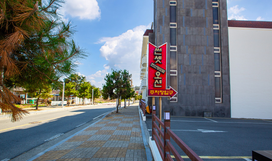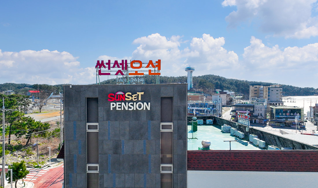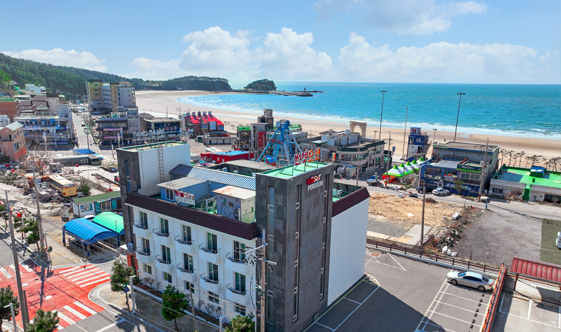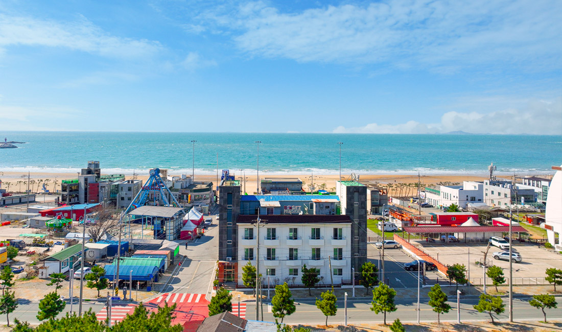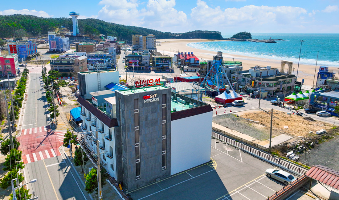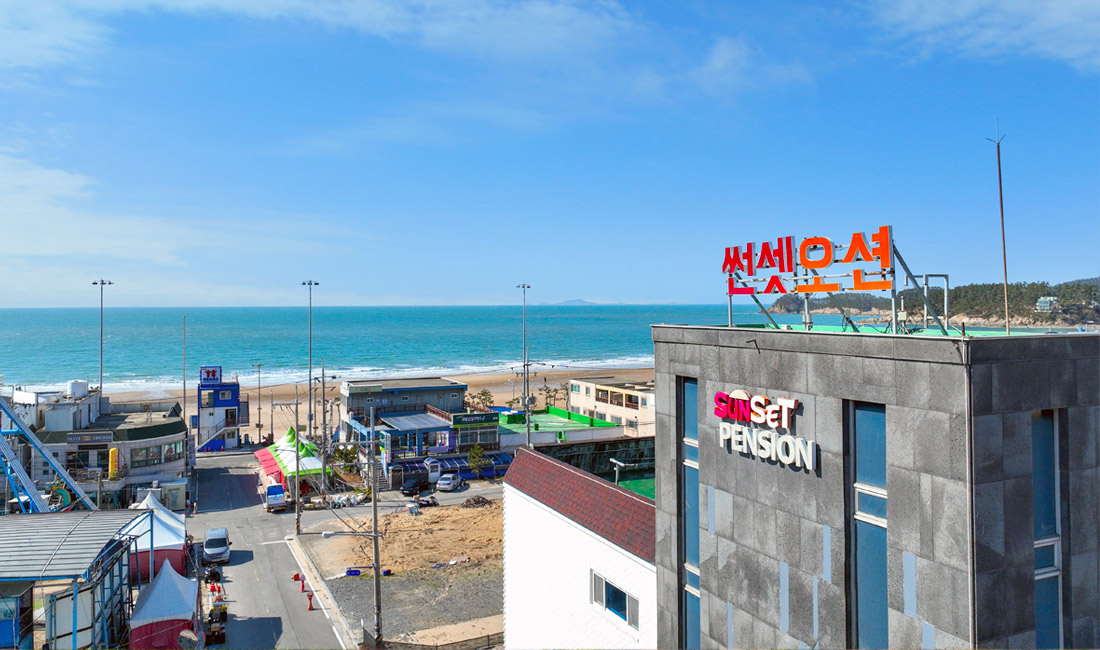 만리포해수욕장과 50m 정도 거리에 위치한 만리포 썬셋오션의 외부전경을 미리 보실 수 있습니다.